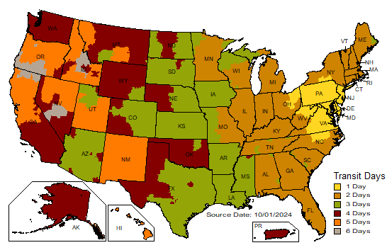 Most orders ship the same day or the next business day. If your order is placed on a weekend or holiday, it will be shipped the next business day. We ship from Frederick, Maryland.  Depending on your location, delivery time is between 1 to 6 business days.  We are not responsible for delays in shipments due to the shipping company. Use the map below to estimate the number of business days for shipping to your location.
